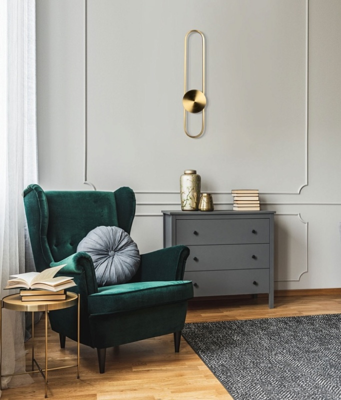 Металлическое основание вертикального бра гальванизировано в цвет латуни. Корпус плафона выполнен из сплава алюминия и гальванизирован в цвет основания. Светодиодный источник света закрыт силиконом белого цвета.