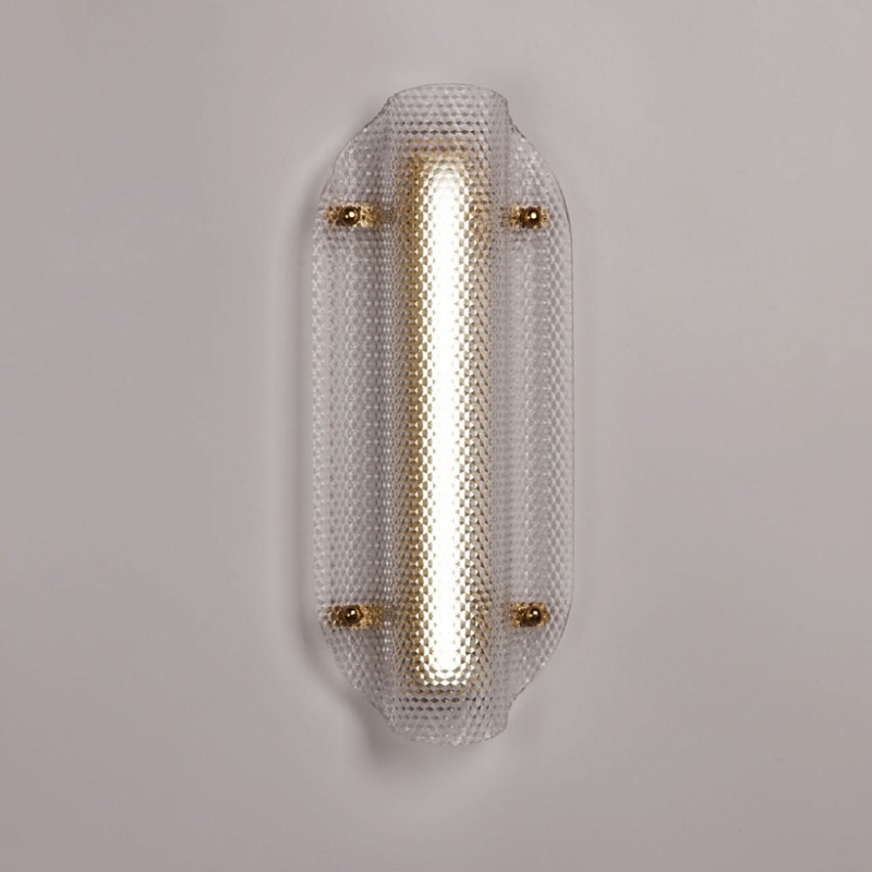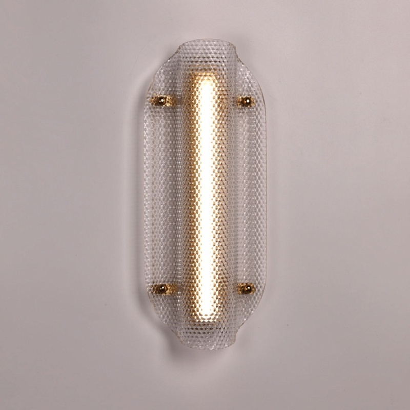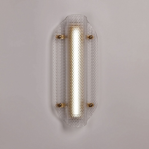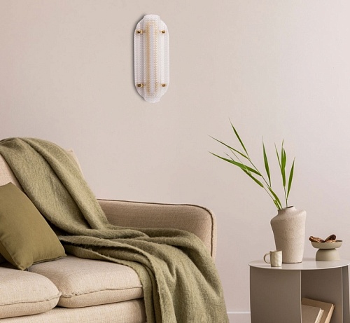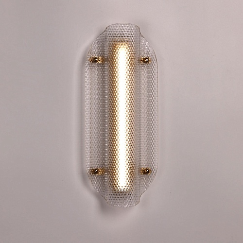 Металлическое основание настенного бра гальванизировано в цвет латуни. Плафон выполнен из прозрачного фактурного литьевого акрила.