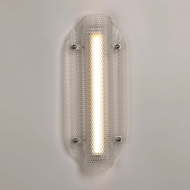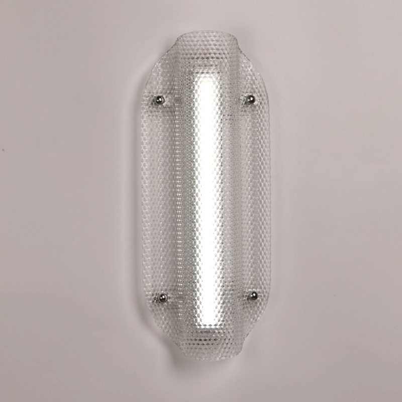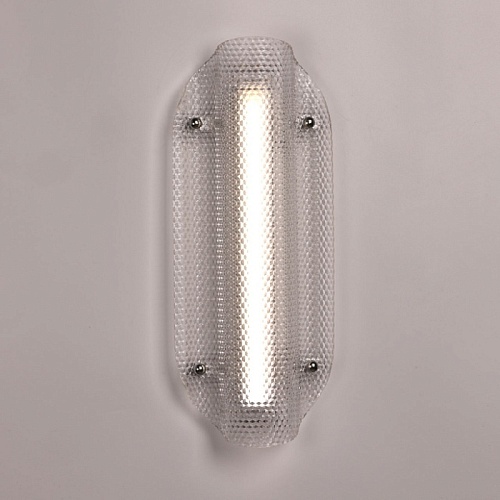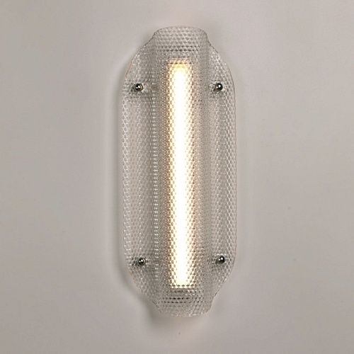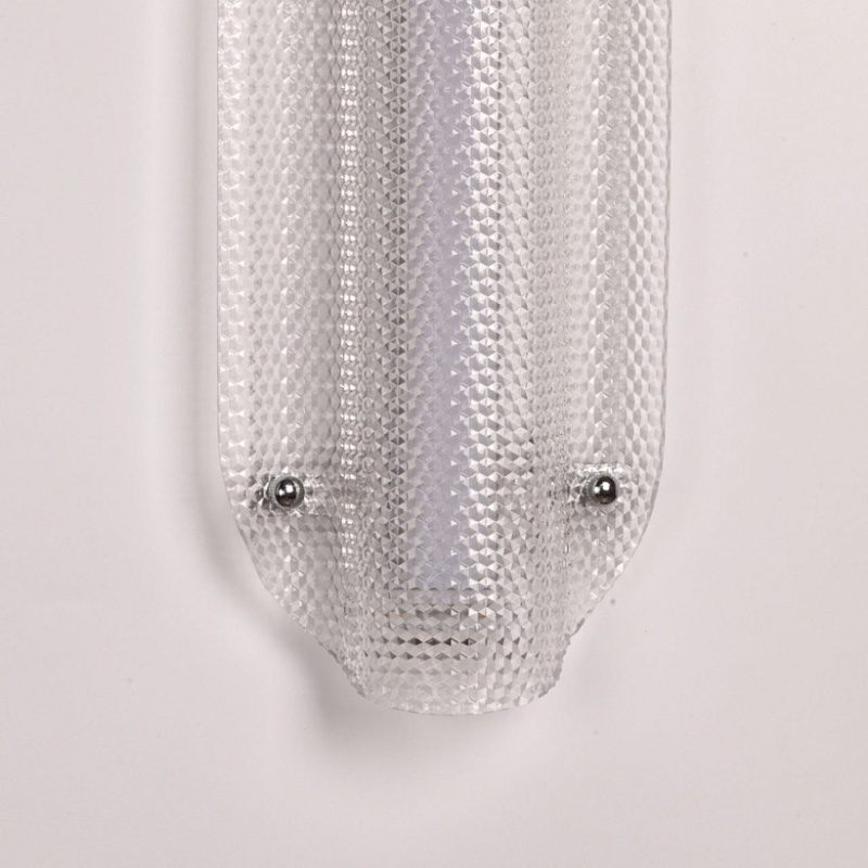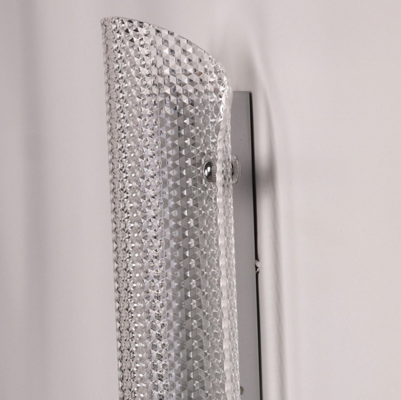 Металлическое основание настенного бра окрашено в цвет перламутрового серебра. Плафон выполнен из прозрачного фактурного литьевого акрила.