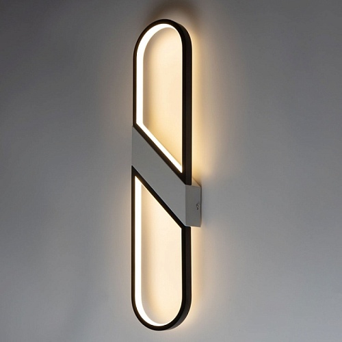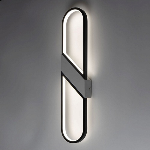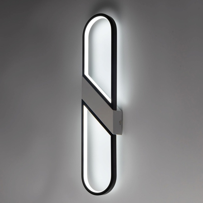Металлическое основание настенного бра и плафон из сплава алюминия окрашены в черный и белый цвета. Светодиодный источник света закрыт белым матовым силиконом.