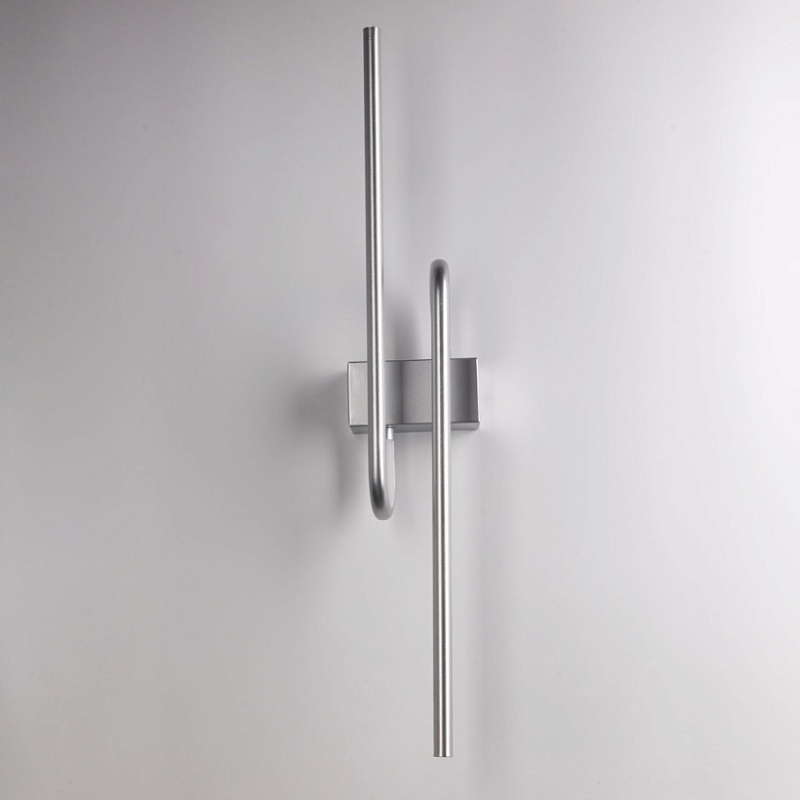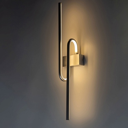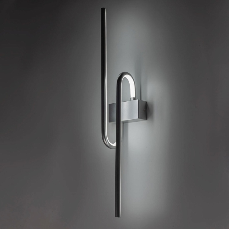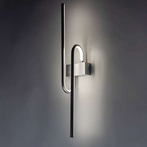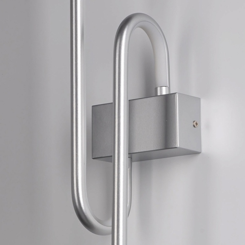 Металлическое основание настенного бра и плафоны из сплава алюминия окрашены в серебряный цвет. Светодиодный источник света закрыт белым матовым силиконом.