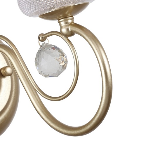 каркас из цвета светлого золота, абажур из белой органзы, декоративные элементы выполнены из прозрачного стекла и прозрачного хрусталя