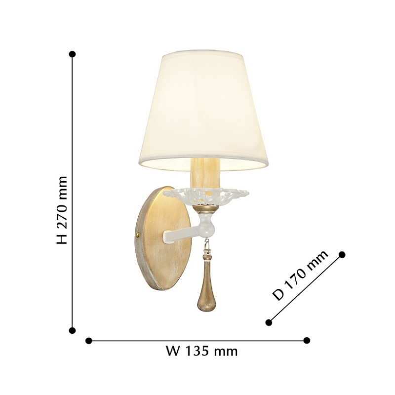 каркас белого цвета и цвета - античное золото, абажур из белой ткани, декоративные подвески в виде удлиненных стеклянных капель на золотых цепочках