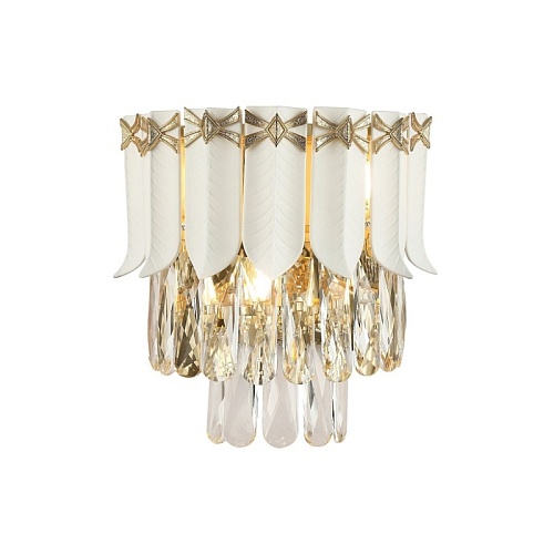 каркас золотого цвета, керамические пластины белого цвета с золотым орнаментом, подвески из хрусталя высшего качества