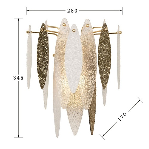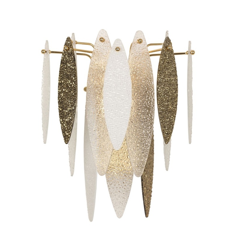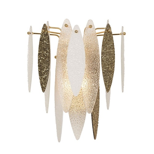 каркас золотого цвета, стеклянные полупрозрачные, белые и золотые пластины миндалевидной формы с эффектом мокрого стекла