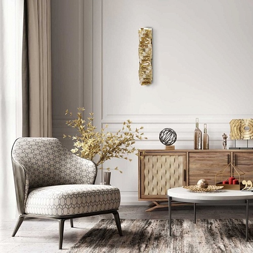 Основание настенного бра выполнено из нержавеющей стали и гальванизировано в цвет золота. Настенный светильник декорирован прозрачным хрусталем прямоугольной формы.