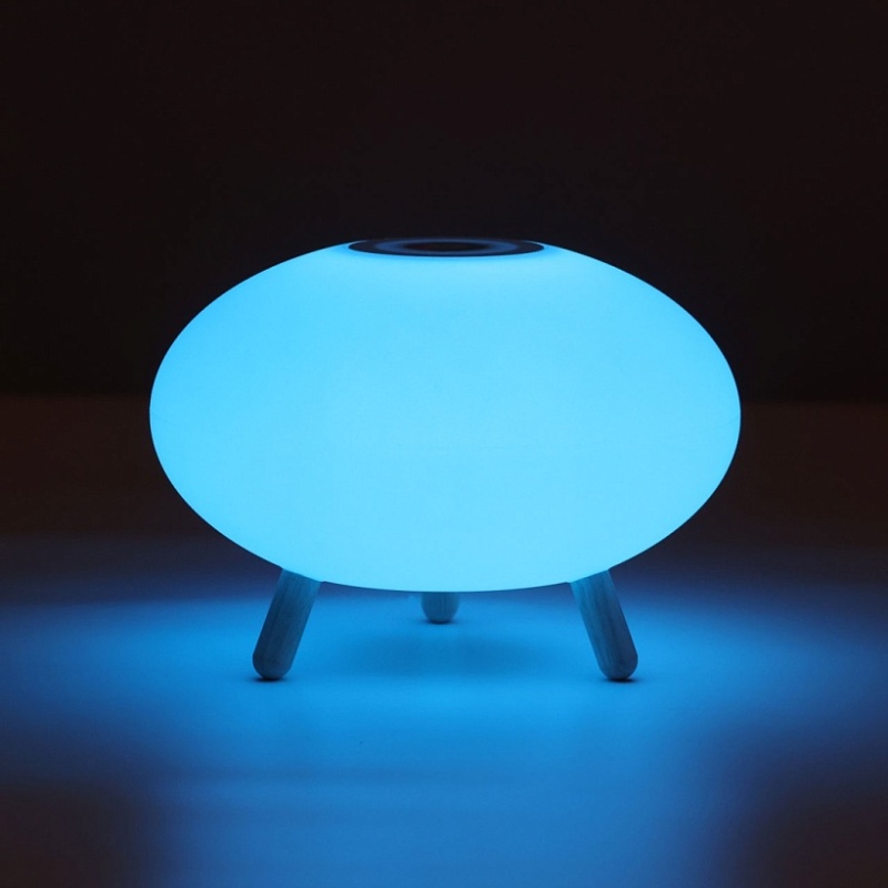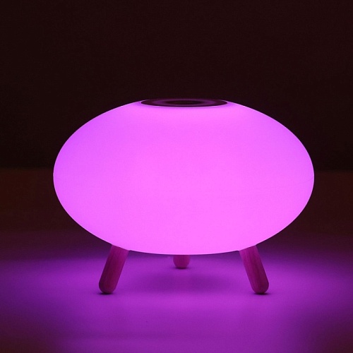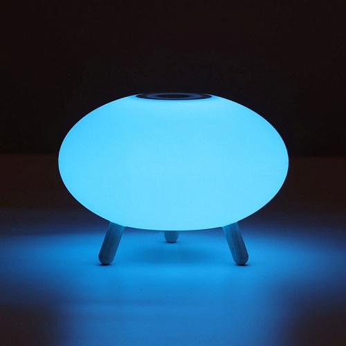 Светодиодный источник света белый, теплый+RGB закрыт белым матовым акрилом.Настольная лампа устанавливается на деревянные ножки цвета светлого дерева.Управление светильником расположены на корпусе плафона. Зарядный кабель USB входит в комплект.