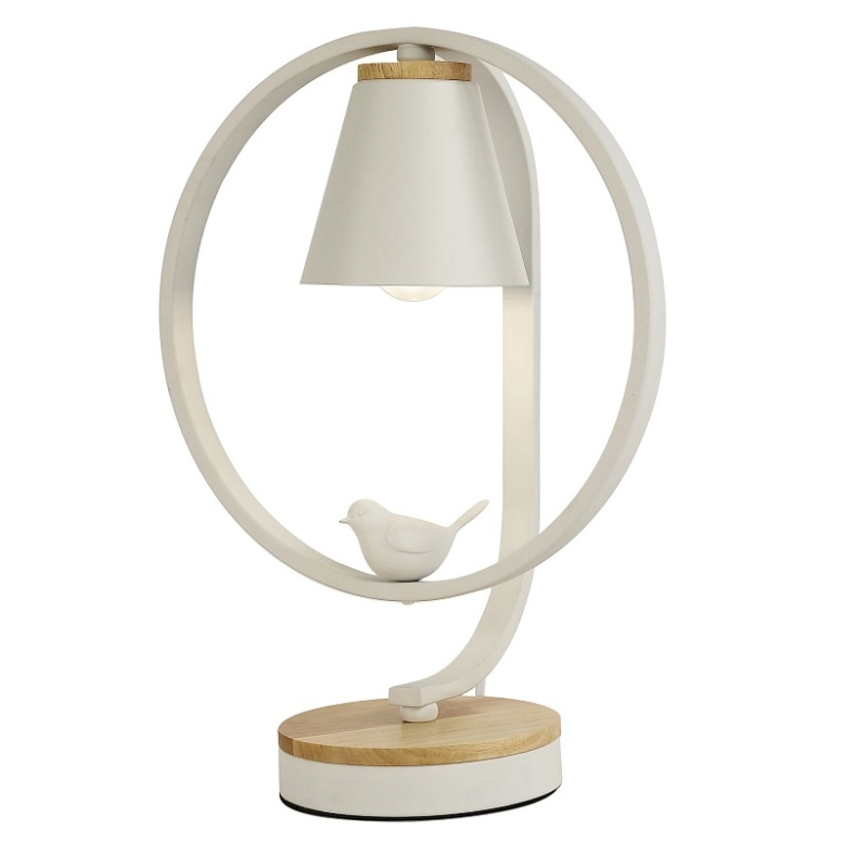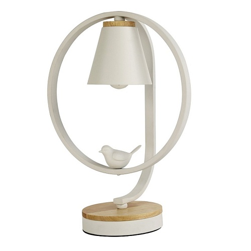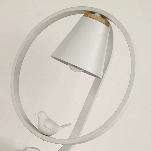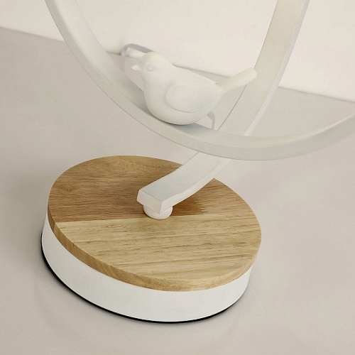 Металлический каркас матового белого цвета, декоративные вставки из светлого дерева, декоративный элемент в виде белой акриловой птицы, сидящей на декоративном обруче.