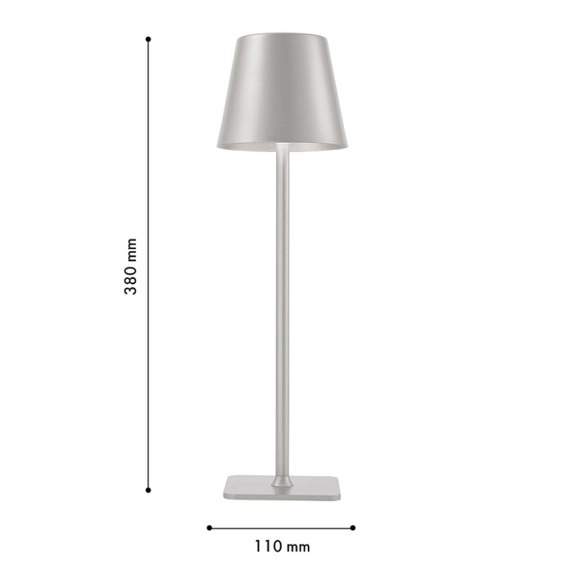 Беспроводная лампа, корпус из металла серого цвета, рассеиватель из акрила, управление касанием, зарядка через USB-порт, LED-модуль.