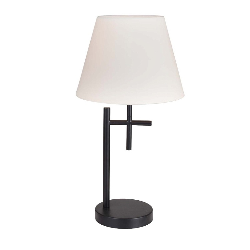 Каркас из металла черного матового цвета, белый тканевый абажур, выключатель на проводе, цоколь Е14.