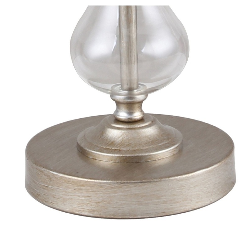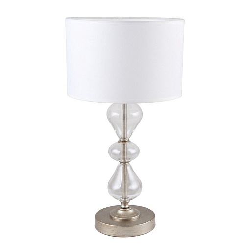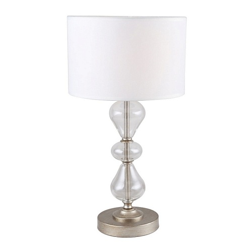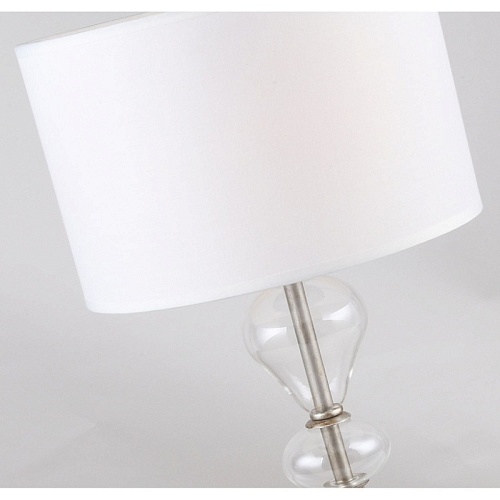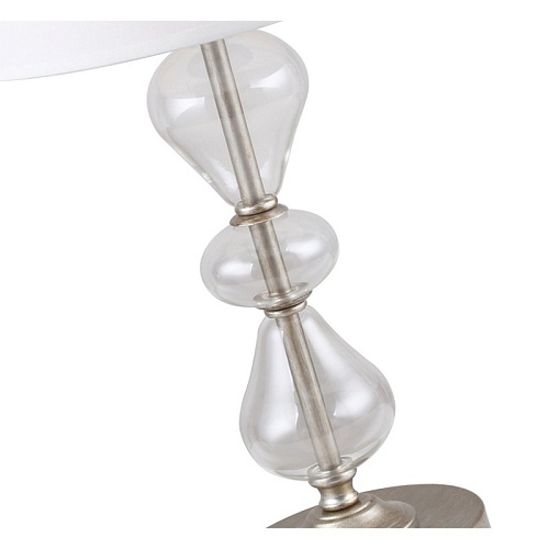 Каркас цвета античное серебро, плафон из белой ткани, декоративные элементы из прозрачного выдувного стекла.