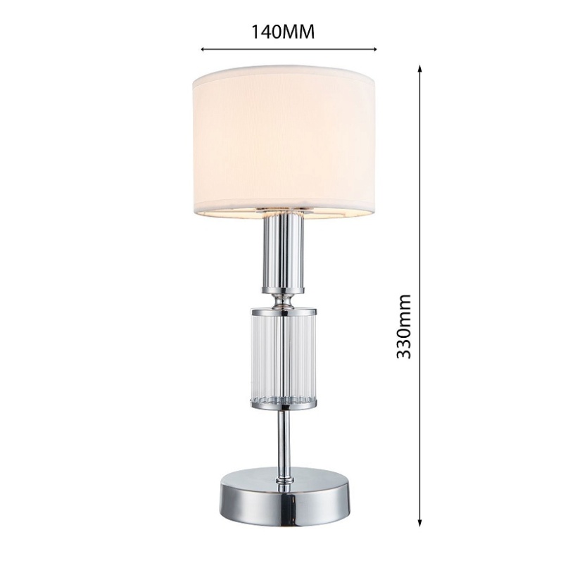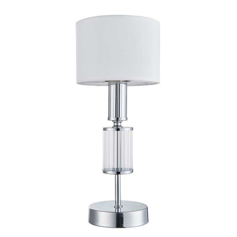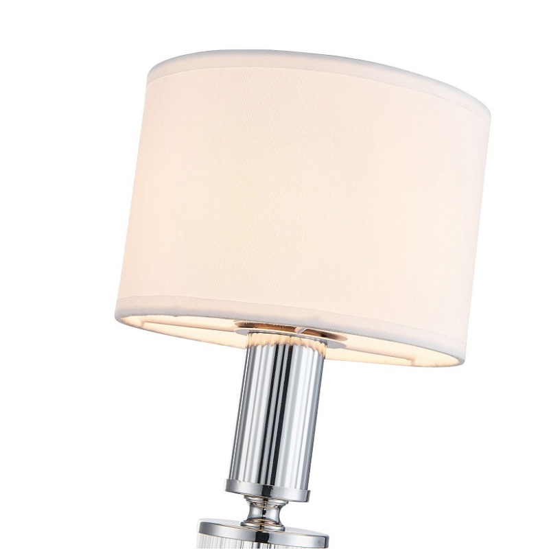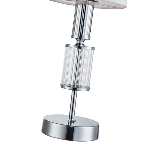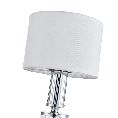 Хромированный металлический каркас, плафоны из белой ткани, декоративные элементы из прозрачного стекла.