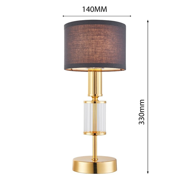 Хромированный металлический каркас, плафоны из серой ткани, декоративные элементы из прозрачного стекла.