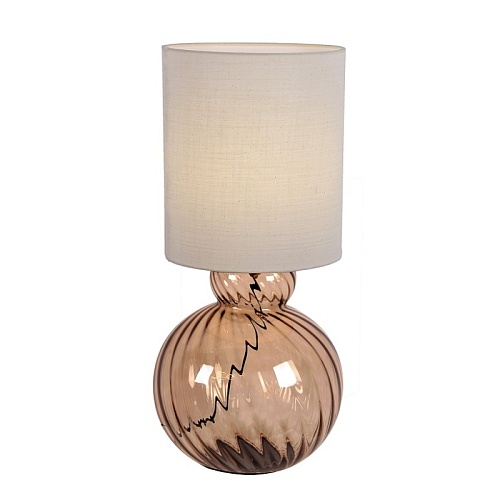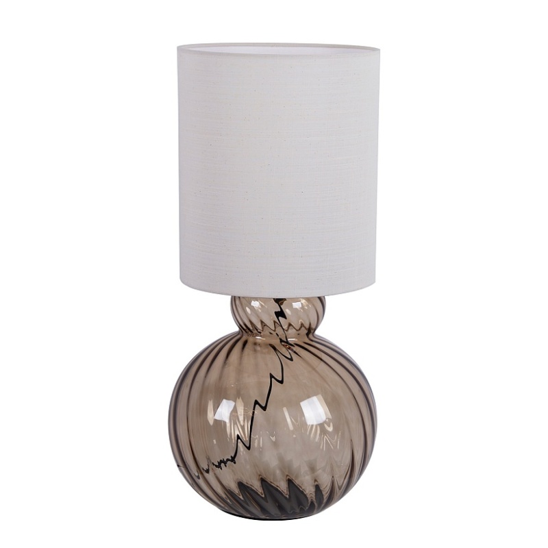 Настольная лампа с основанием из выдувного дымчатого фактурного стекла и тканевым абажуром в сером цвете, цоколь Е14, регулируемая высота.