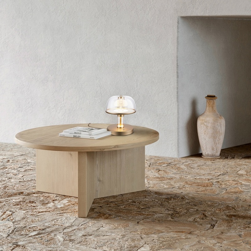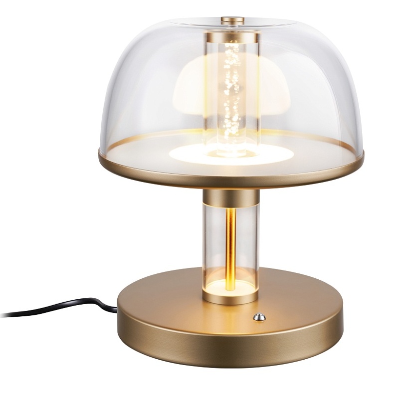 Металлический каркас в цвете матовое золото, акриловый плафон со встроенным декоративным цилиндром из воздушных пузырьков внутри плафона, переходящей в матовый стержень во внешней части. Плоский двухсторонний LED-модуль, сенсорный выключатель.