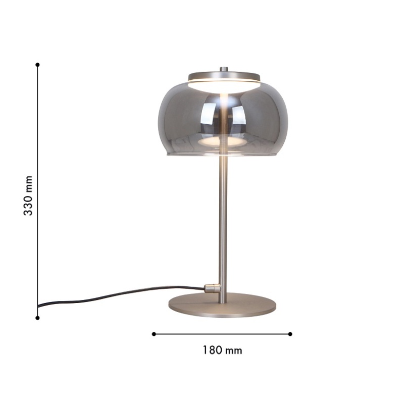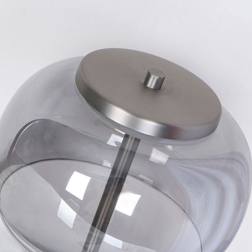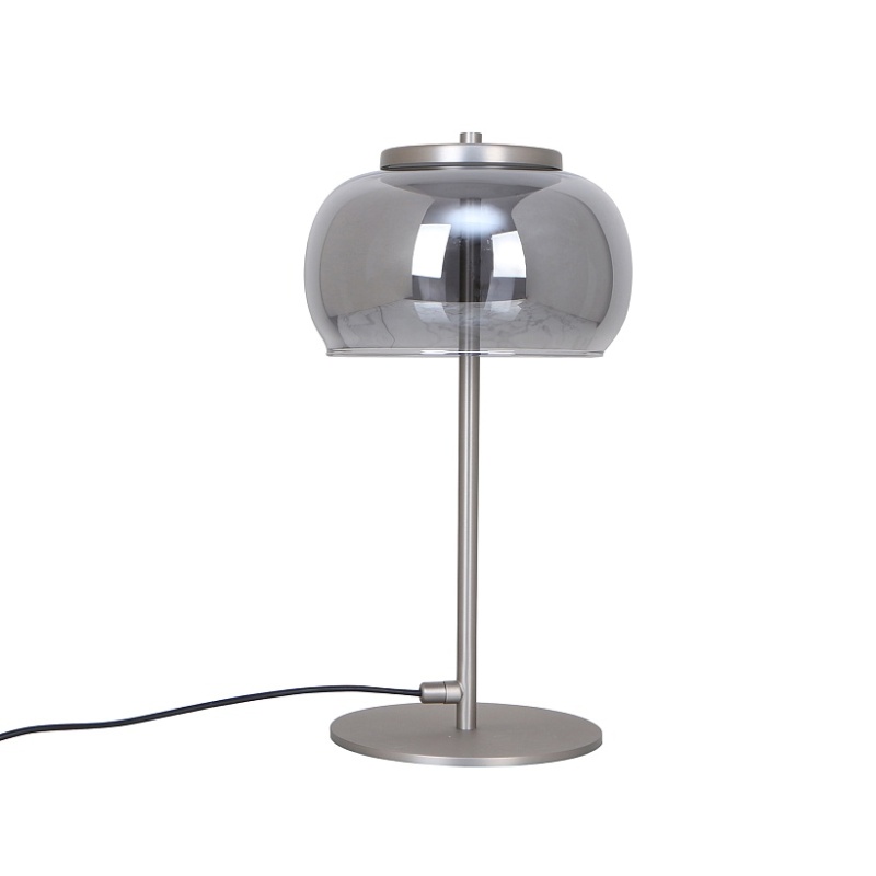 Настольная лампа в цвете никель, с плафоном из выдувного стекла дымчато-серого цвета, встроенный модуль LED.