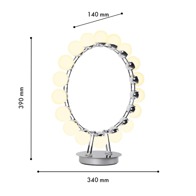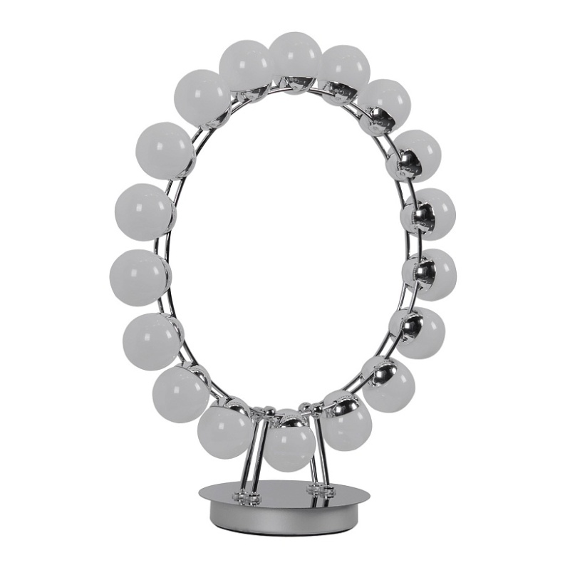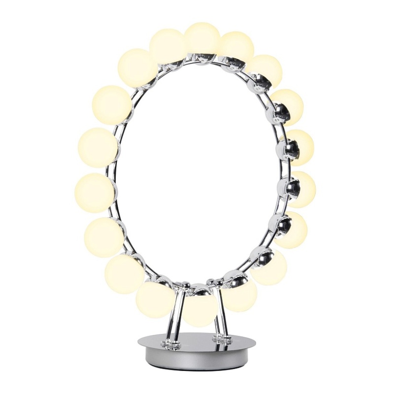 Металлический хромированный каркас, плафоны в форме белых акриловых шариков.