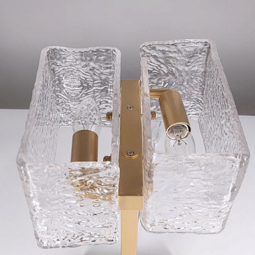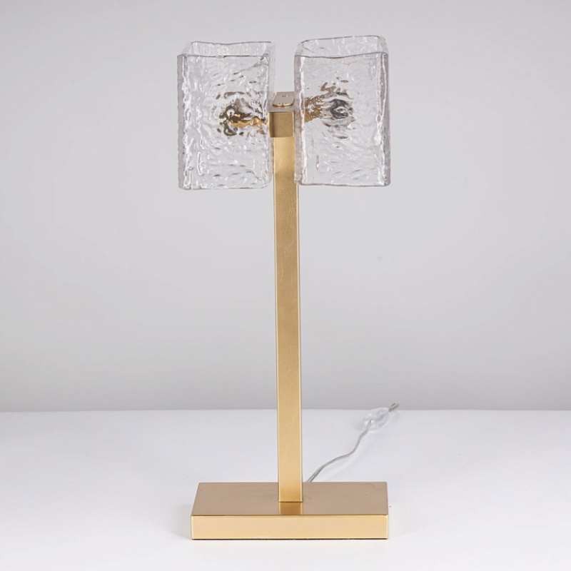 Металлическое основание настольной лампы гальванизировано в цвет золота. Настольная лампа декорирована плафоном из прозрачного фактурного стекла.