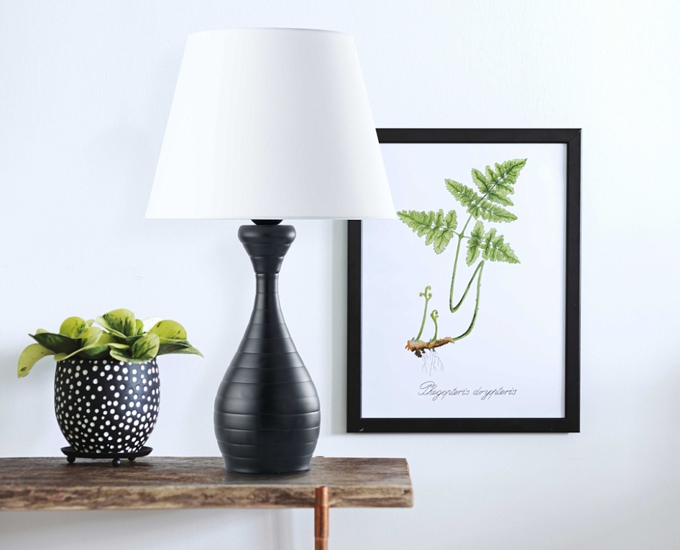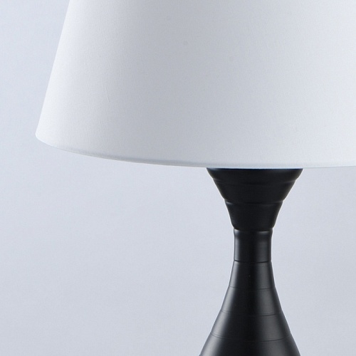 Основание настольной лампы выполнено из металла и окрашено в черный цвет. Светильник декорирован текстильным плафоном белого цвета с термостойким акрилом внутри. Плафон прошит.