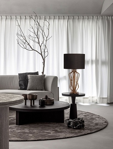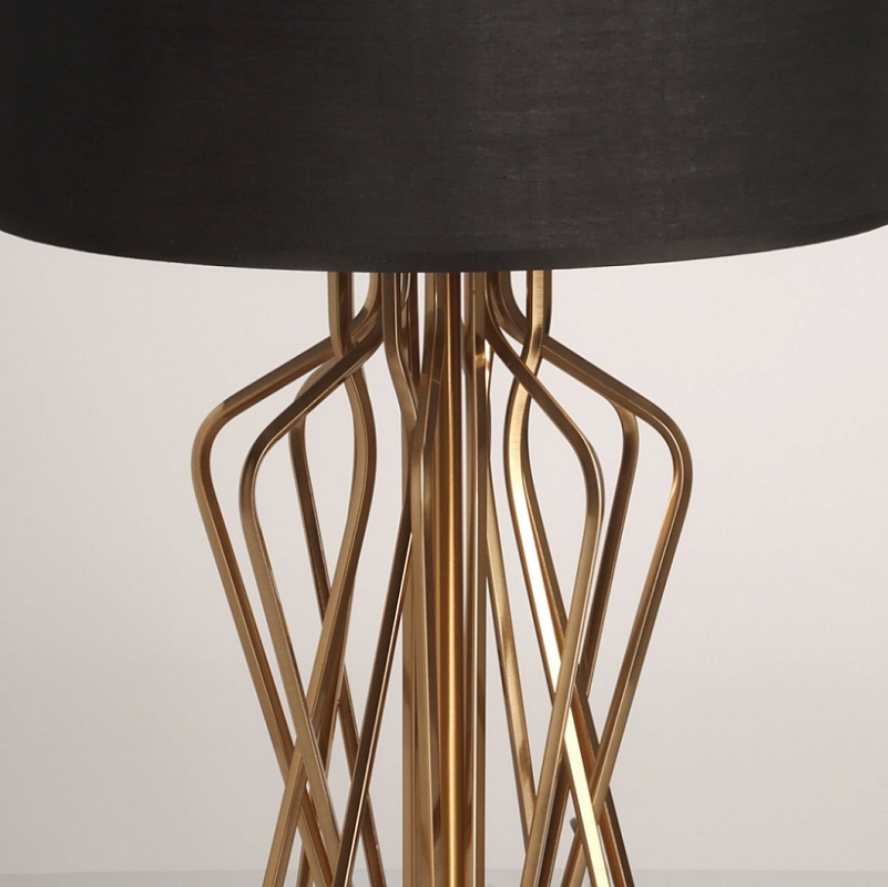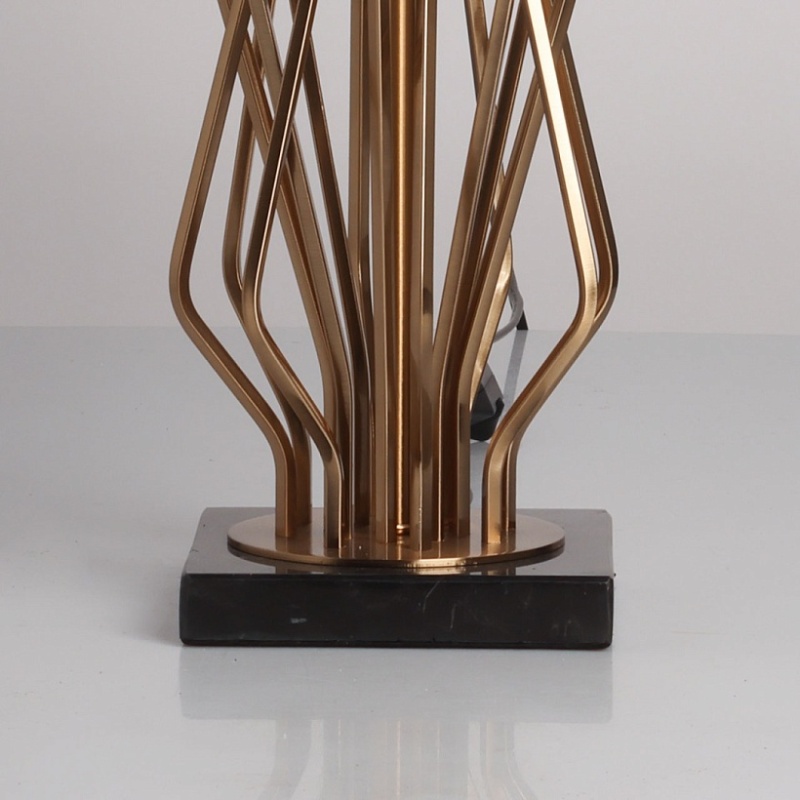 Металлическое основание настольной лампы гальванизировано в цвет медовой бронзы. Заменяемые источники света закрыты двухслойным абажуром, где внутренний слой из прозрачного термостойкого акрила, а внешний - из текстиля черного цвета. В основании настольной лампы используется натуральный мрамор черного цвета.