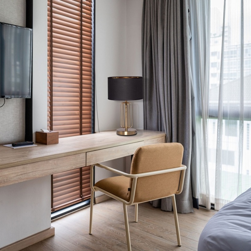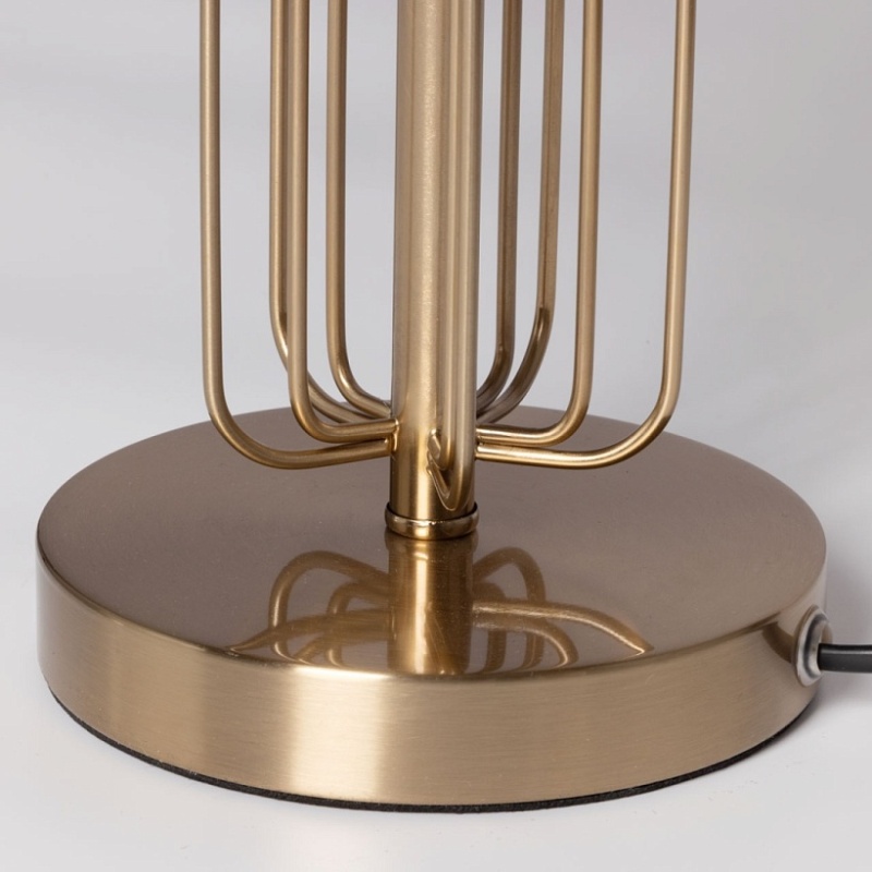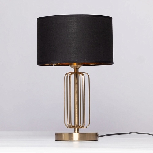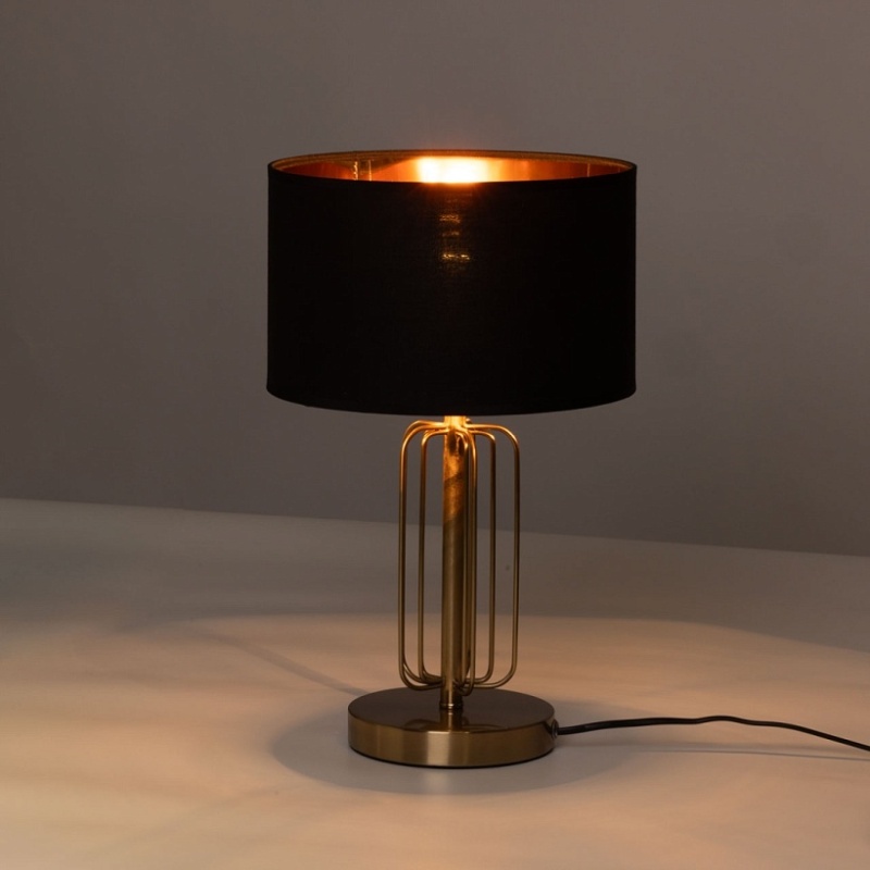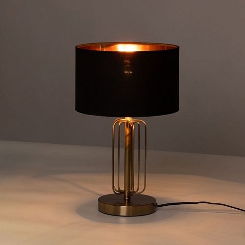 Металлическое основание настольной лампы гальванизировано в цвет латуни. Традиционный источник света закрыт двухслойным текстильным абажуром черного цвета. Внутренний слой выполнен из термостойкого акрила золотого цвета. Абажур прошит.
