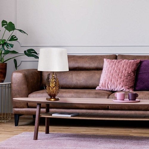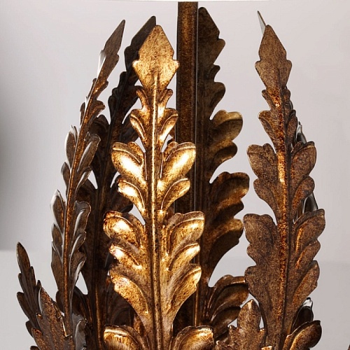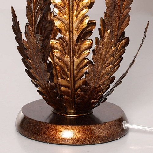 Металлическое основание настольной лампы гальванизировано в цвет античное золото. Лампа декорирована листьями из металла, гальванизированными в цвет основания. Традиционный источник света закрыт двойным абажуром, где внутренний слой выполнен из термостойкого акрила, а внешний - из текстиля белого цвета.