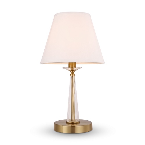 Металлическая арматура в двух оттенках на выбор: латунь и никель. Абажуры – текстиль белого цвета. Декоративные элементы из прозрачного стекла. Источник света – лампа с цоколем E14.