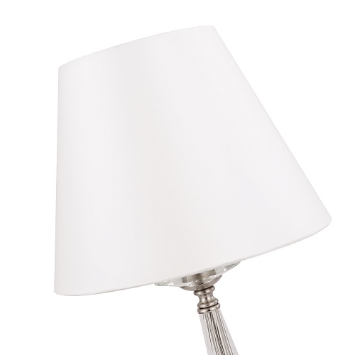 Металлическая арматура в двух оттенках на выбор: латунь и никель. Абажуры – текстиль белого цвета. Декоративные элементы из прозрачного стекла. Источник света – лампа с цоколем E14.