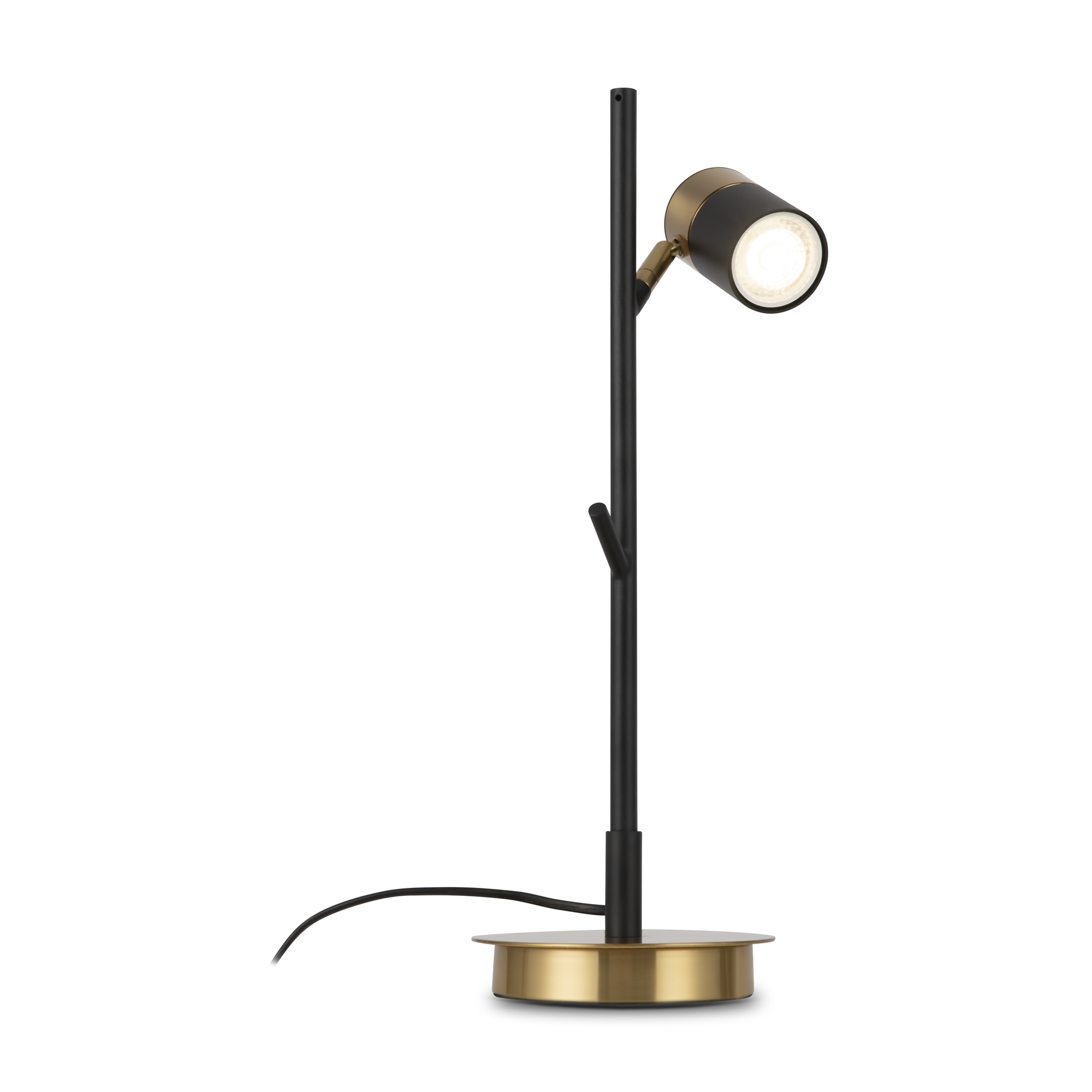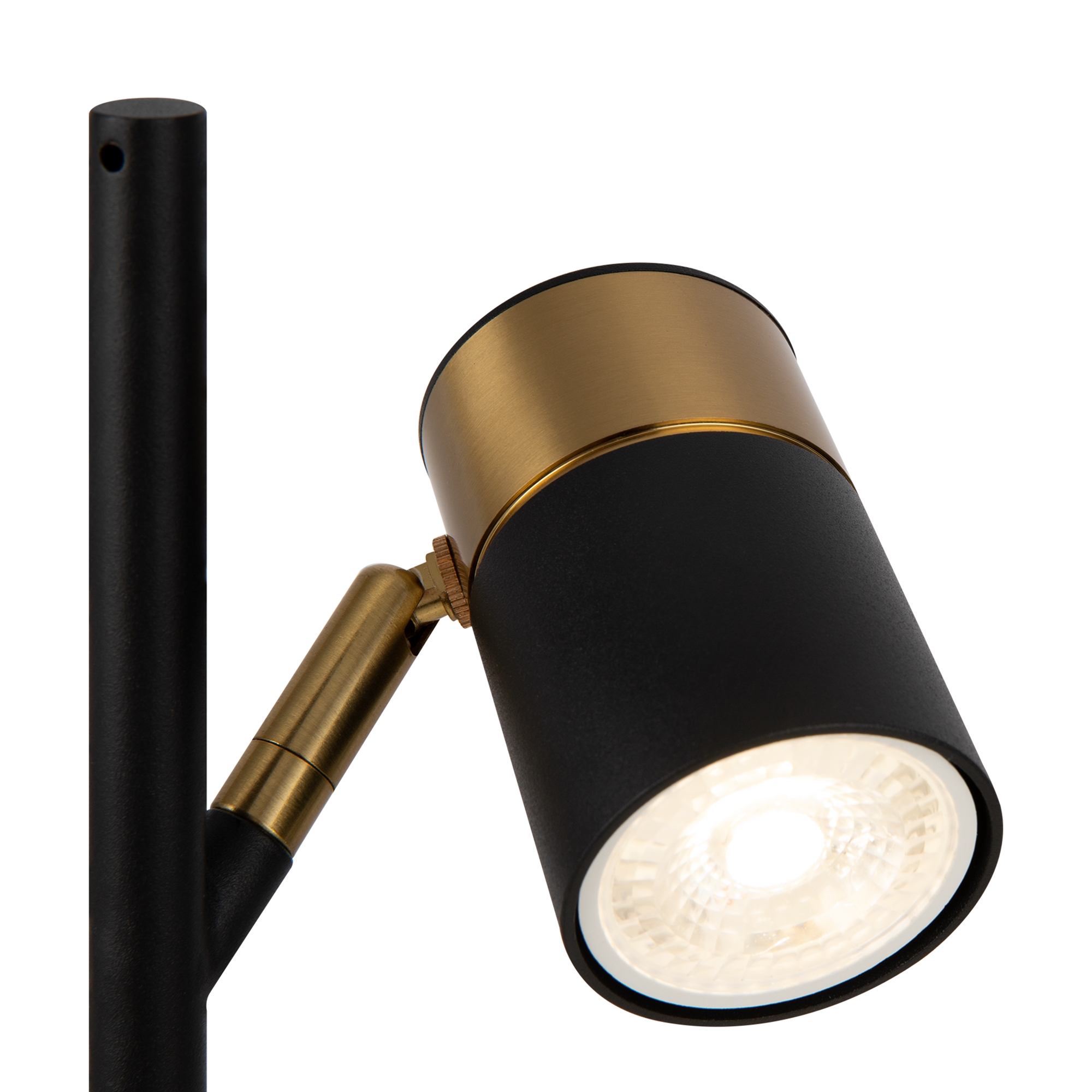 Арматура и плафоны из металла. Черный цвет дополнен латунной окантовкой. Поворотные плафоны и арматура позволяют видоизменять композицию и регулировать направление светового потока. Источник света – лампа GU10.