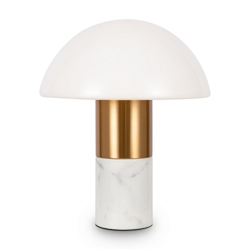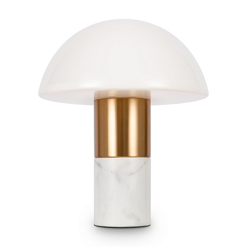 Материал арматуры — метал, цвет — латунь. Основание - белый мрамор с серым рисунком. Плафон из глянцевого стекла в форме полушара. Источник света — лампа с цоколем E14