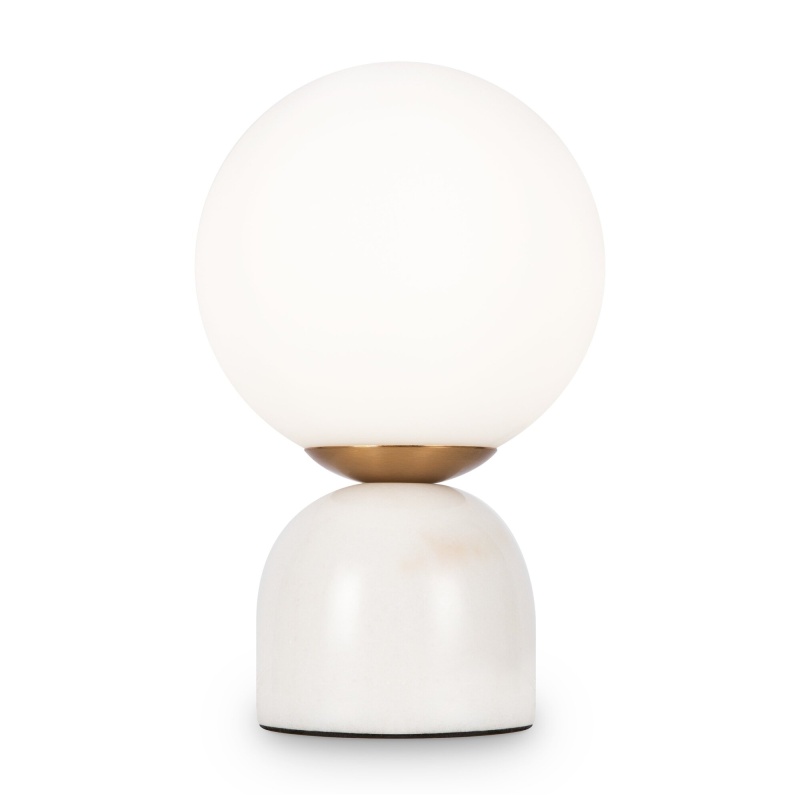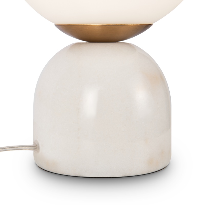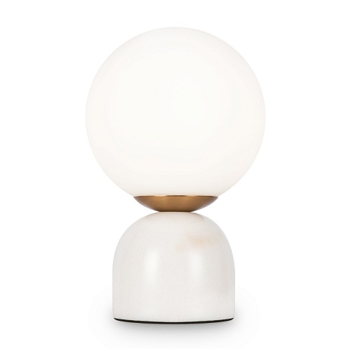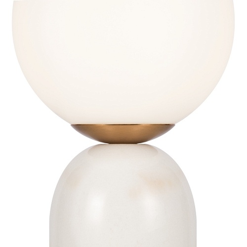 Материал основания — натуральный мрамор с уникальным рисунком. Цвета — белый, черный. Шаровидный плафон. Источник света — лампа с цоколем E14.