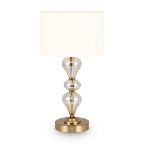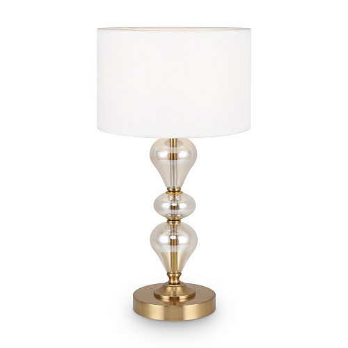 Арматура из металла, цвет — латунь. Плафоны — тканевые, молочного цвета. Металлическая конструкция декорирована выдувными стеклянными элементами с перламутровым напылением. Источником света служит лампа с цоколем Е14.