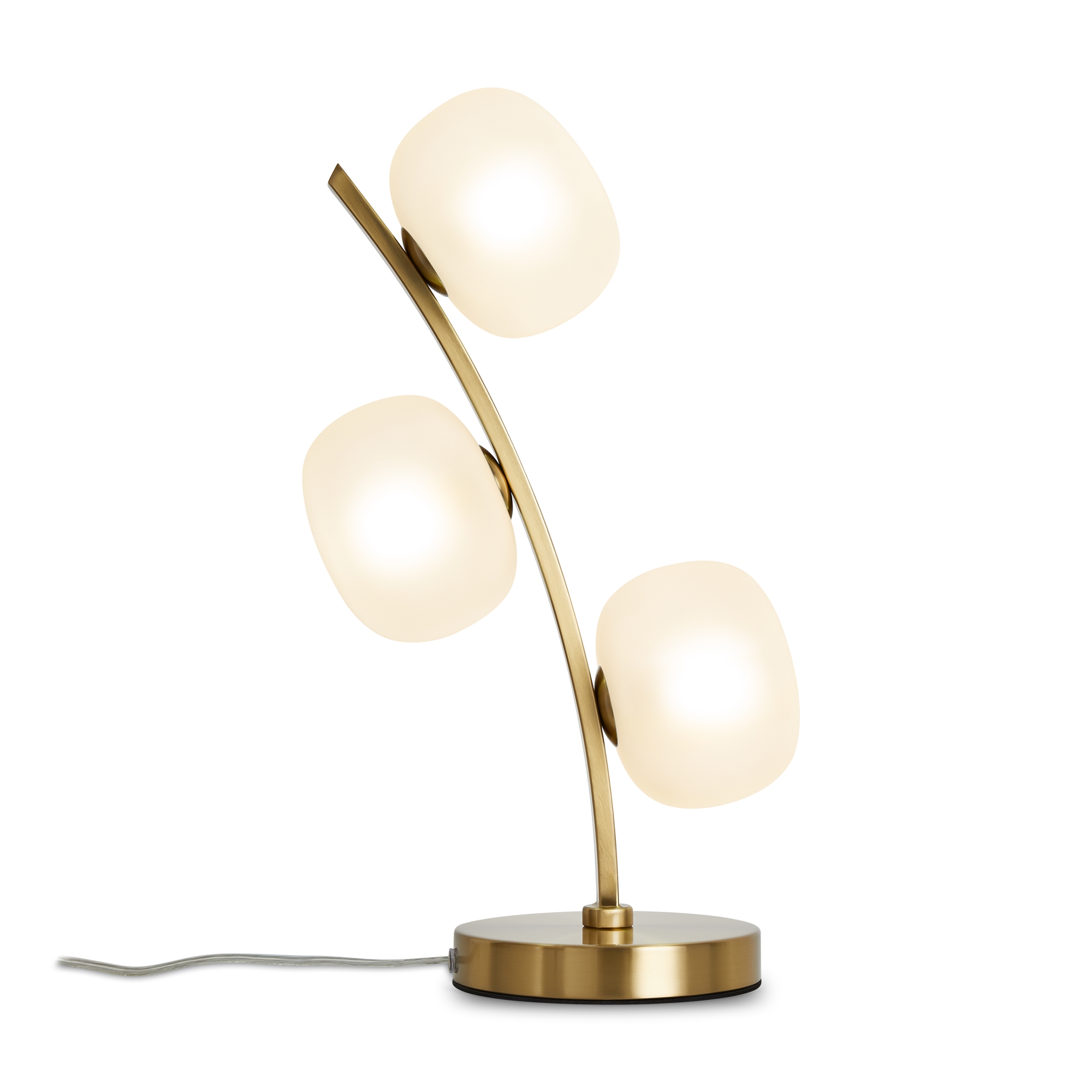 Арматура - металл. Цвет арматуры - латунь. Серия с необычной формой плафонов — немного приплюснутые, матовые белые. Настольные лампы и настенные бра выгнутой формы. Источник света лампа. Цоколь G9.