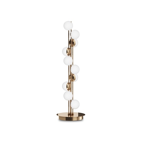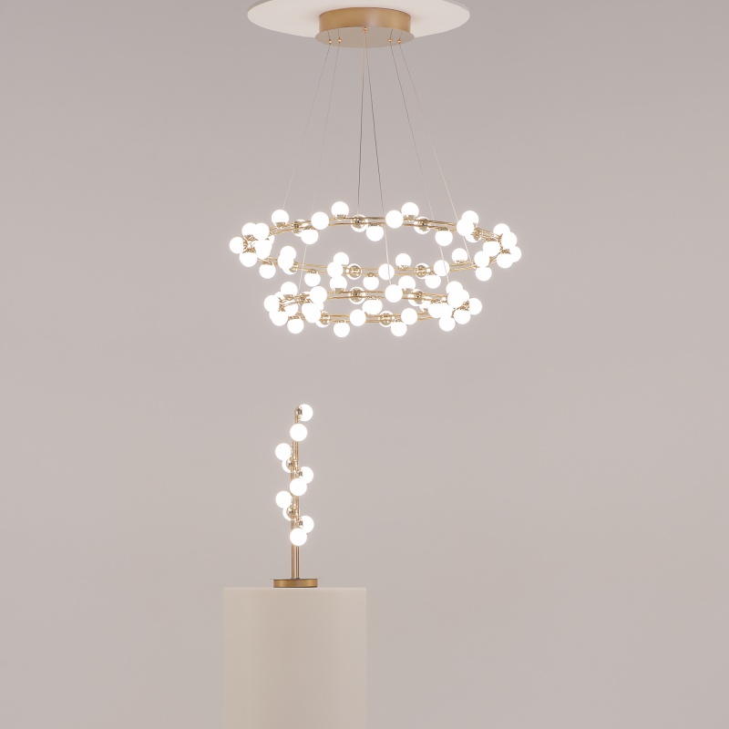 Арматура из металла в золотом цвете. Плафоны-сферы — белый пластик. Дизайн с имитацией молекулярной структуры. LED-источники света.