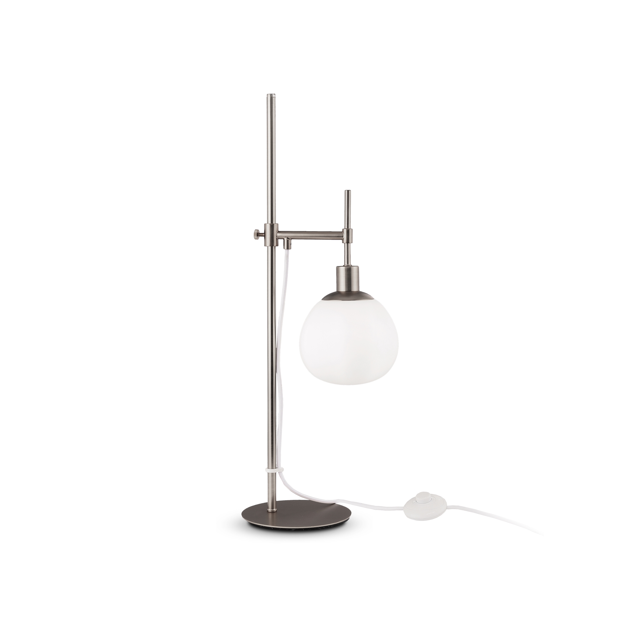 Металлическая арматура, цвет – никель, латунь. Плафоны – выдувное стекло белого цвета. Широкая семья. У торшера и настольной лампы можно изменять положение плафона. Регулируемая высота.