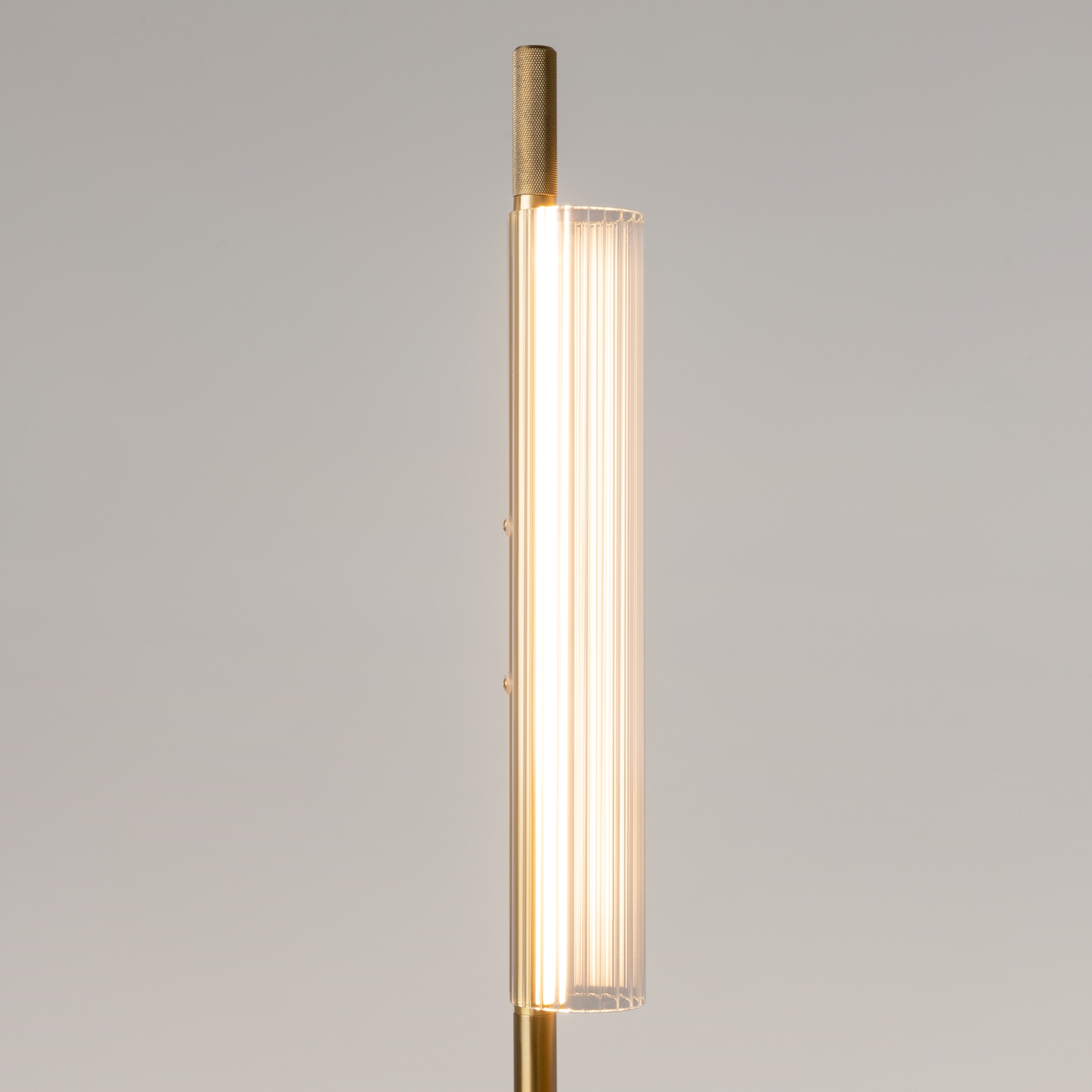 Арматура из металла, цвет - латунь с сатиновым финишем. Плафон из рифленого прозрачного стекла. LED-источник света. Теплая цветовая температура 3000К. Регулируемый по длине провод 3 метра у подвесного светильника. Подходит для помещений с высокими потолками. Торшер с push-кнопкой на проводе для удобного включения и выключения.