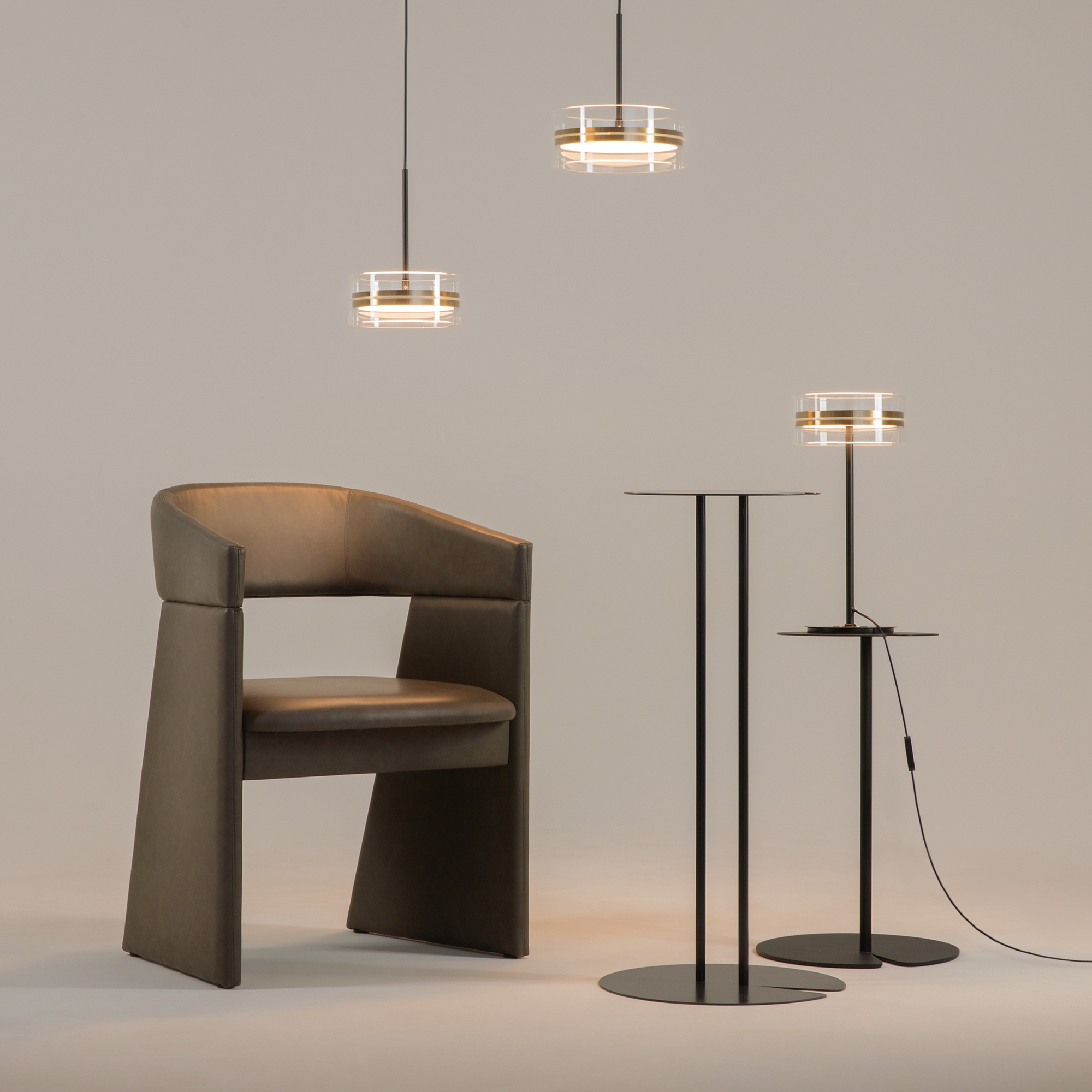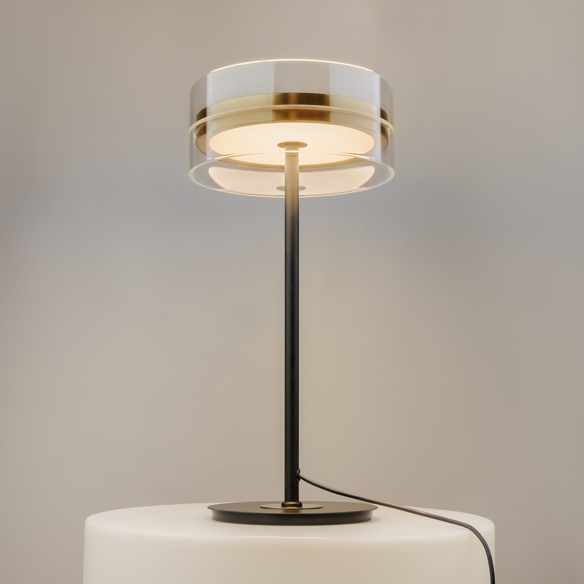 Плафоны подчеркнуто лаконичной формы в виде правильного цилиндра из стекла, дополненные металлической комбинированной черно-латунной арматурой. Источник света: LED. Цветовая температура — 3000К, угол рассеивания — 120 градусов. Провод длиной 3 метра можно регулировать. Светильники серии оснащены функцией диммирования: бесступенчатое управление у настольного светильника, а также 3 ступени регулировки - у торшера, подвесных и потолочного светильников. Светильники серии Dress code отличаются строгим и сдержанным дизайнерским оформлением.