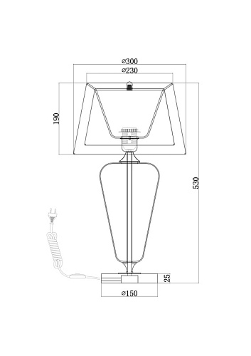 Арматура – металл, оттенки – латунь, хром. Двойной абажур, текстиль 2 видов: лен, полупрозрачная органза. Прозрачные элементы: выдувное стекло, литой акрил в основании.