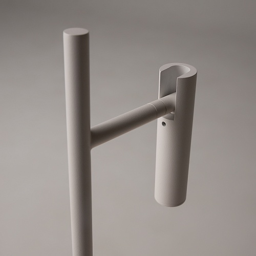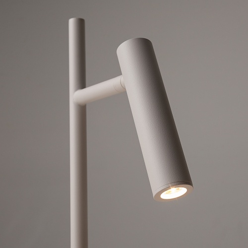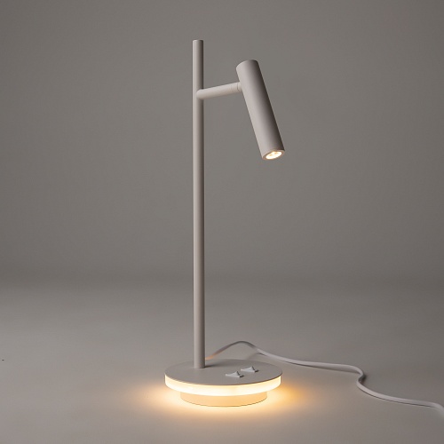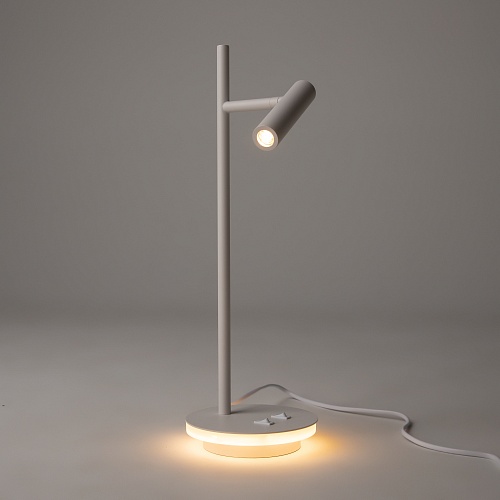 Металлический корпус в черном и белом оттенках. Вращающийся плафон-цилиндр позволяет регулировать направление светового потока. Декоративная подсветка основания. LED источник света, цветовая температура 3000К.