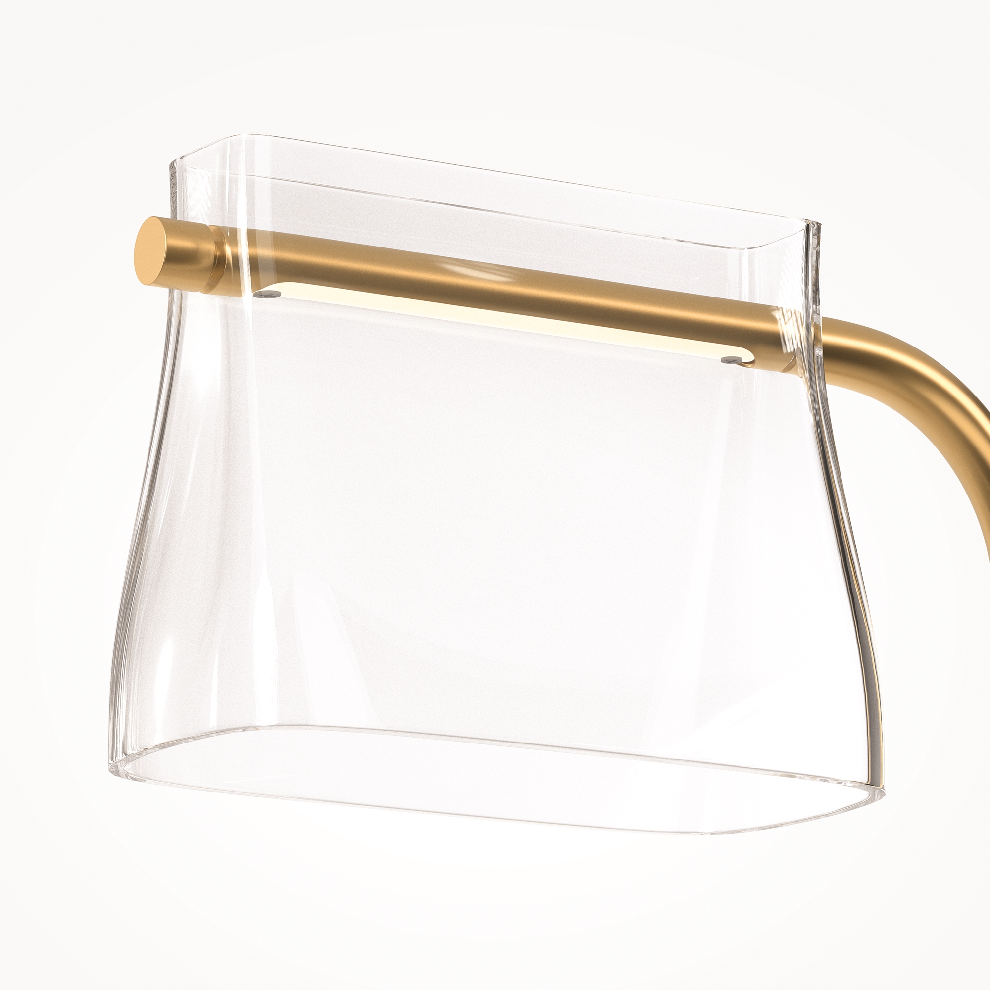 Цвет металлической арматуры — латунь с сатинированным финишем, плафоны — прозрачное стекло. Источник света: LED. Цветовая температура светильников 3000К, угол рассеивания — 120 градусов. Настенные бра и подвесные светильники оснащены регулируемым проводом длиной до 3 метров, что позволяет использовать их в помещениях с высокими потолками.