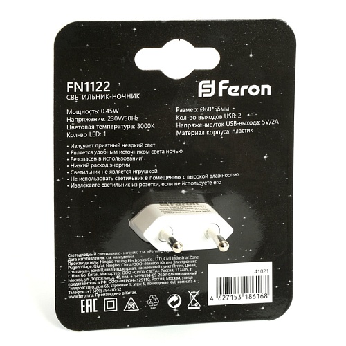 Светильник ночник Feron c 2мя USB выходами, FN1122 0,5W 230V, белый 41021