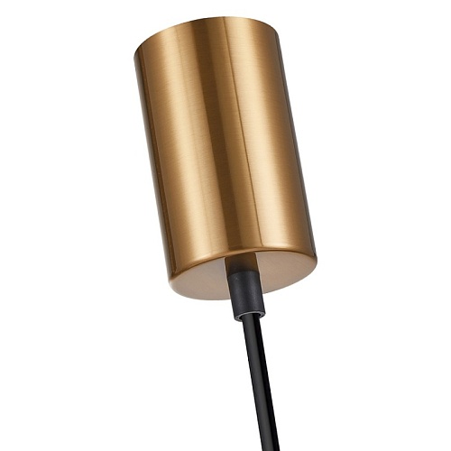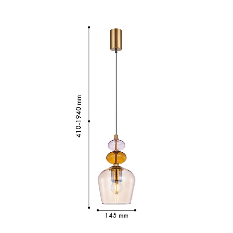 Металлический каркас в цвете латунь, выдувной плафон из янтарного стекла, декоративный элемент в розовом и латунном цвете, цоколь E27, регулируемая высота.