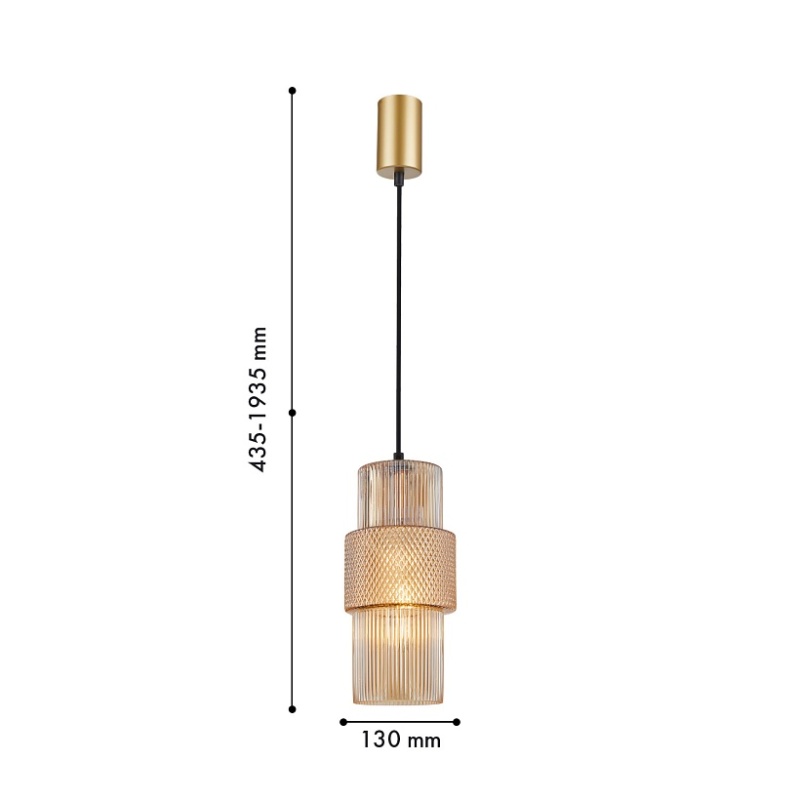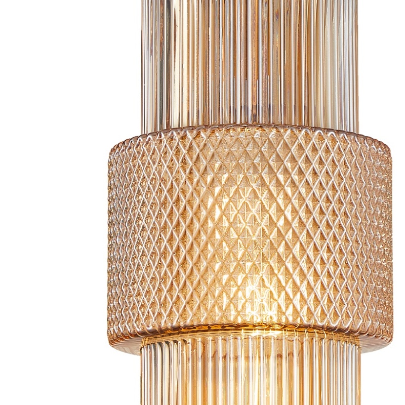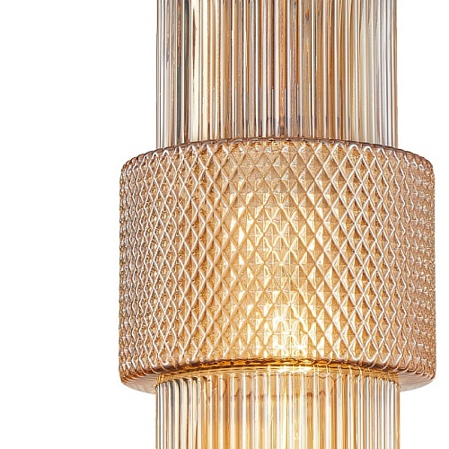 Подвес с каркасом в цвете латунь, плафон из стекла в янтарном цвете имеет вертикальные линии и ребристую текстуру с "поясом" из ромбиков поясом по центру. Цоколь E27, регулируемая высота.