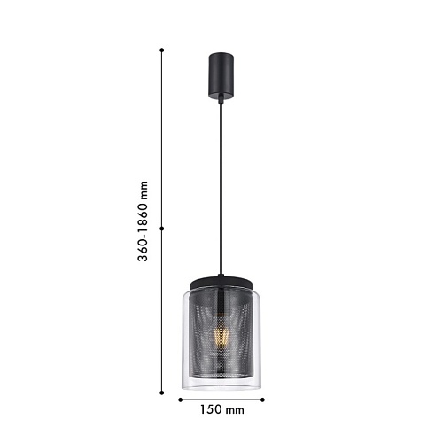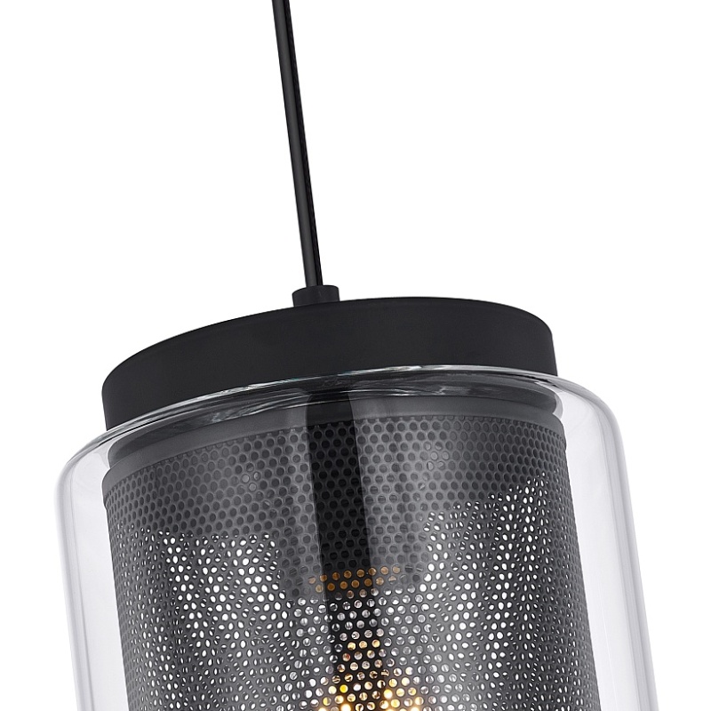 Металлически каркас черного цвета, черная сетка внутри стеклянного прозрачного плафона, цоколь E27, регулируемая высота.