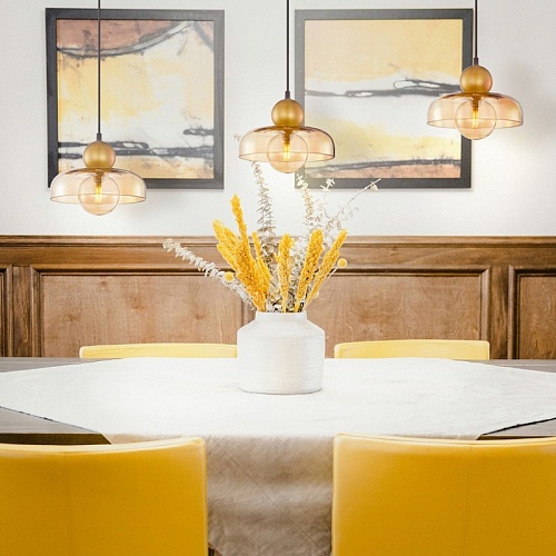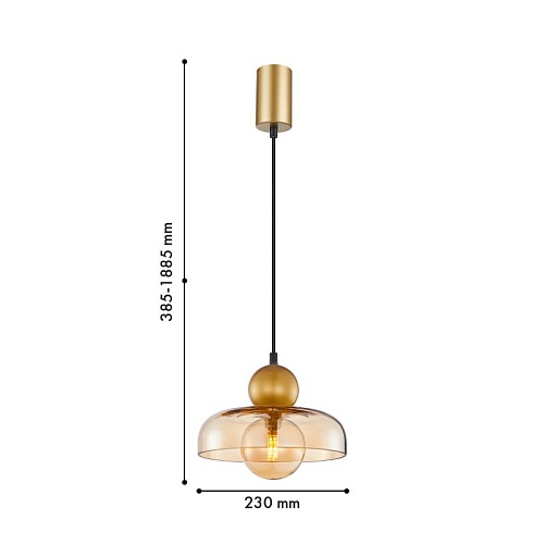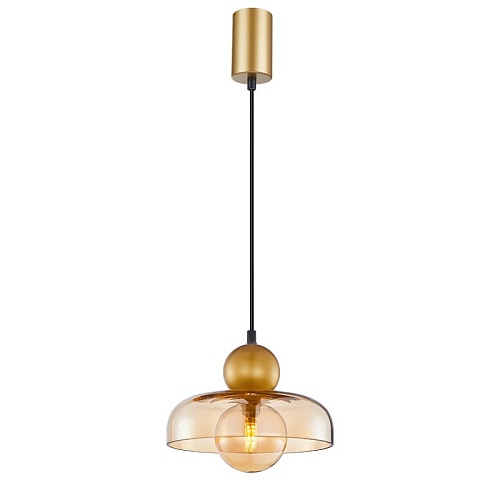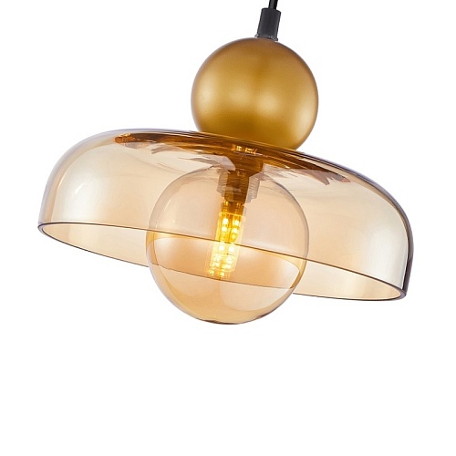 Металлический каркас в цвете матовое золото, с двумя шарами из металла и стекла, которые пересекает внешний плафоном в виде купола. Сочетание янтарного и золотого цвета, сменная лампа G9LED, регулируемая высота.