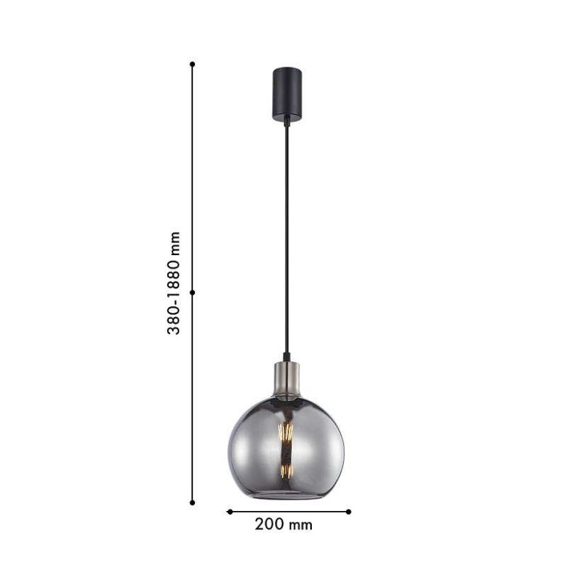 Металлический каркас черного цвета, выдувной плафон дымчато-серого цвета, цоколь Е27,сменная лампа, регулируемая высота.