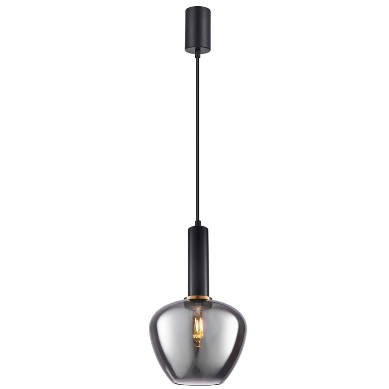 Металлический каркас в цвете латунь, выдувной плафон дымчато-серого цвета, цоколь Е27,сменная лампа, регулируемая высота.