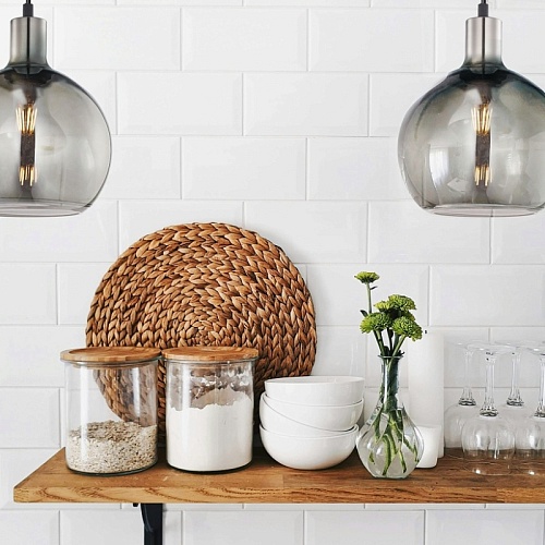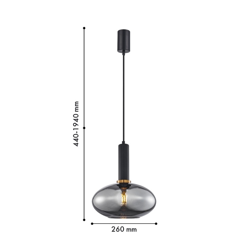 Металлический каркас в цвете латунь, выдувной плафон дымчато-серого цвета, цоколь Е27,сменная лампа, регулируемая высота.