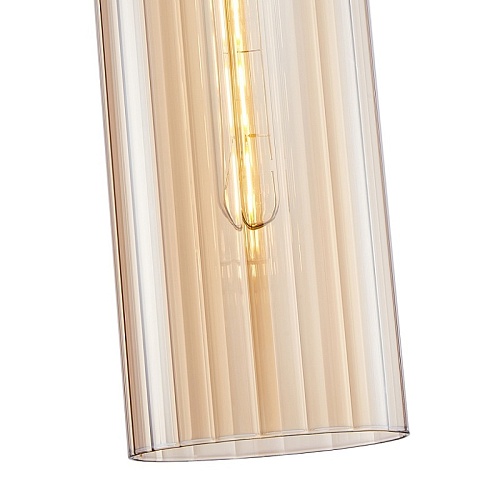 Металлический каркас в цвете латунь, с плафоном из ребристого стекла янтарного цвета, цоколь Е27, регулируемая высота.