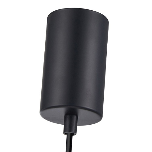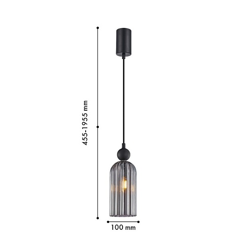 Металлический каркас черного цвета, плафон из фактурного стекла дымчато-серого цвета, декоративный металлический шар черного цвета, регулируемая высота, цоколь Е14.